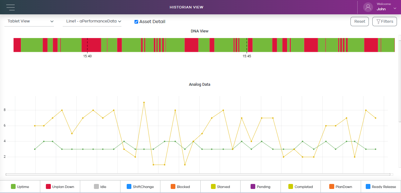 ABLE 4.2 can plot line speed info and ramp up/down data against production state model data to correlate downtime to centerline data.